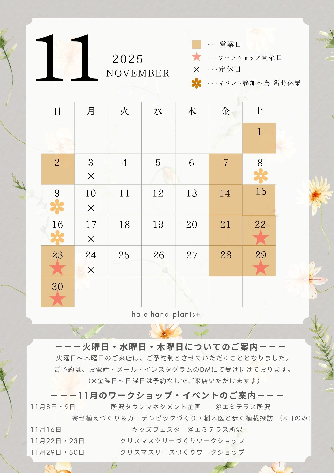 11月の営業日のお知らせです♪ 11月はイベント参加が多く営業日が少な…